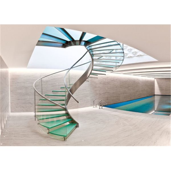 Laminated glass tread , glass railing with handrail, curved staircase